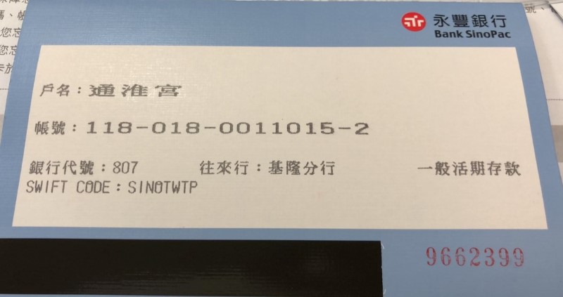 3. 匯款完成後,請再電話至通淮宮事務小姐,告知匯款訊息及個人資料。